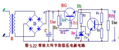 Usrmin 为整流输出的最小电压。Ic2可取1~3毫安。稳压管DW的稳定电压Uw,选择范围比较宽,只要不使BG2 饱和(即Uw比Usc 低2伏以下)均可。Uw取得大,取样电压可大些,有利于提高稳压性能。限流电阻R3通过的电流I3,应该等于DW的稳定电流,那应满足下述关系: