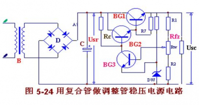 图中,BG1 是调整管,BG2 是比较放大管。输出电田变化量△Usc 的一部分与基准电压Uw 比较,并经BG2 放大后进到了BG1 的基极。Rc 是BG2 的集电极电阻,又是BG1 的上偏置电阻。R1、R2是BG2 的上、下偏置电阻,组成分压电路,把ΔUsc 的一部分作为输出电压的取样,送给BG2 的基极,因此又叫