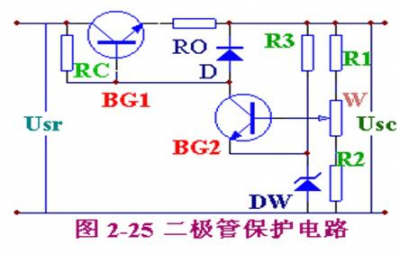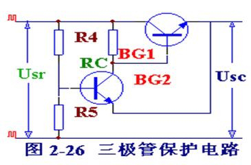 图2-26是三极管保护电路。由三极管BG2和分压电阻R4、R5组成。电路正常工作时,通过R4与R5的压作用,使得BG2的基极电位比发射极电位高,发射结承受反向电压。于是BG2处于截止状态(相当于开路),对稳压电路没有影响。当电路短路时,输出电压为零,BG2的发射极相当于接地,则BG2处于饱和导通状态(相当于短路),从而使调整管BG1基极和发射极近于短路,而处于截止状态,切断电路电流,从而达到保护目的。